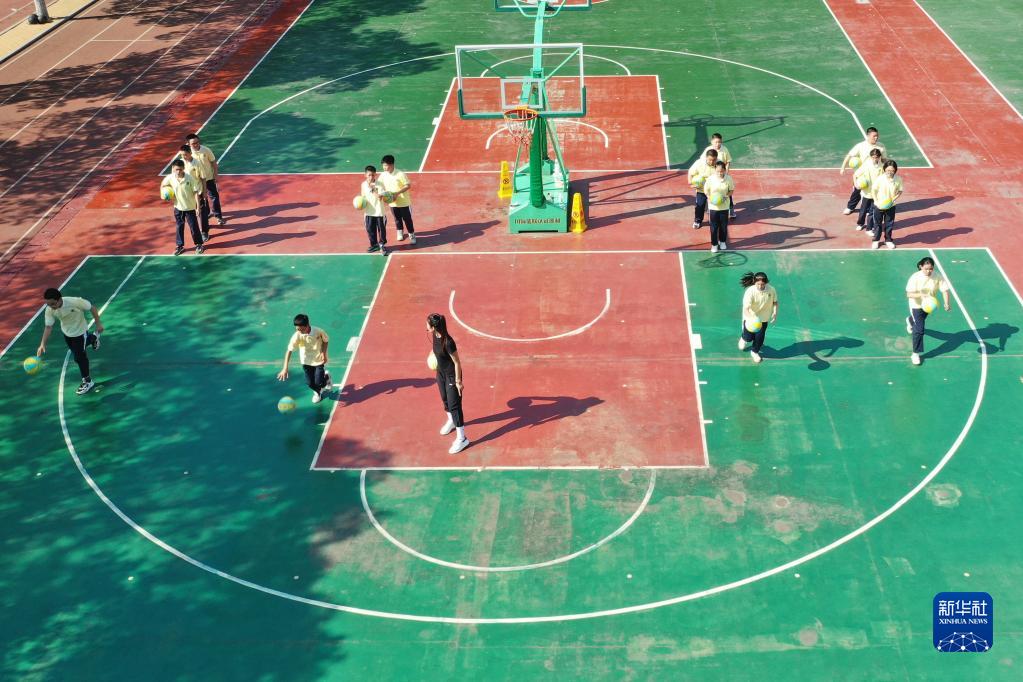 9月6日,于红俊(前中)在长沙市明德华兴中学给学生上体育课(无人机照片)。
