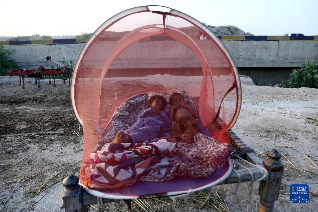9月8日,在巴基斯坦信德省,受洪灾影响的孩子们在蚊帐中休息。