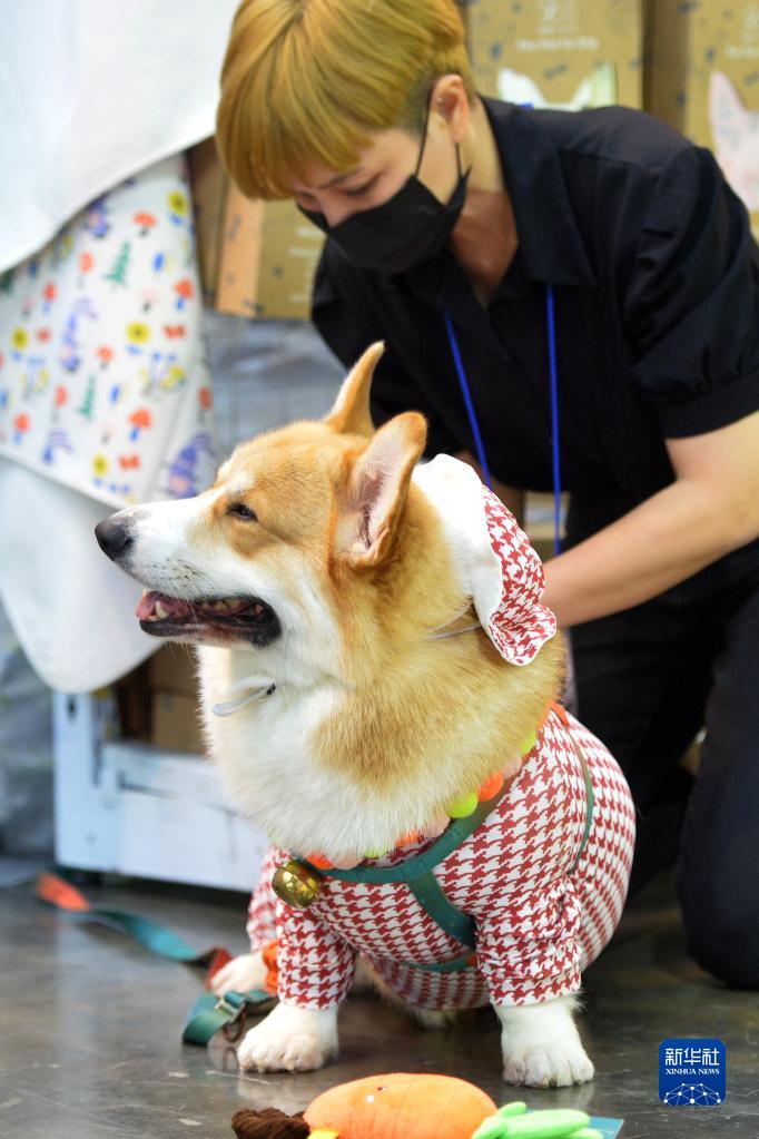 9月8日,工作人员在泰国曼谷举行的宠物博览会上展示一只宠物狗。