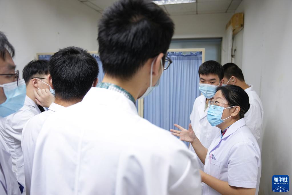 在北京鼓楼中医医院(南院区),张琳(前右)为实习的大学生讲解实际操作注意事项(9月7日摄)。