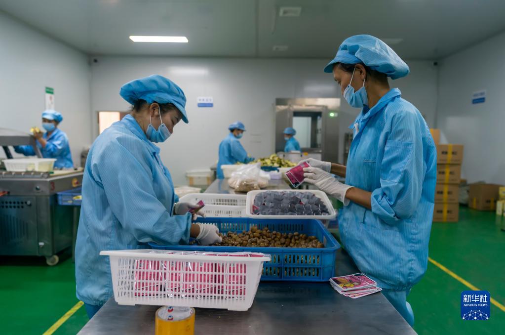9月9日,在禄丰市中村乡一家板栗加工企业,工作人员将板栗装袋。