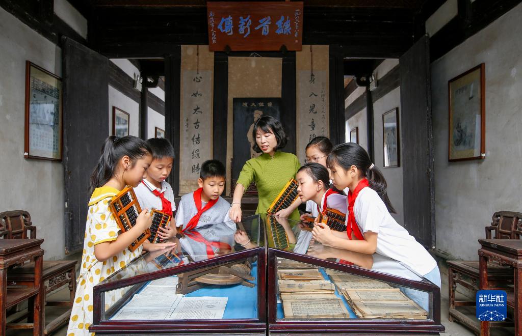 9月7日,在安徽省黄山市程大位故居,汪素秋为孩子们介绍程大位所著典籍。