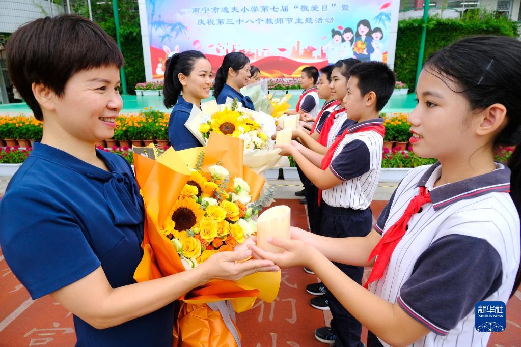 当日,广西南宁市逸夫小学举行第七届“敬爱日”暨庆祝第三十八个教师节主题活动,整个校园洋溢着尊师爱生的气氛。
