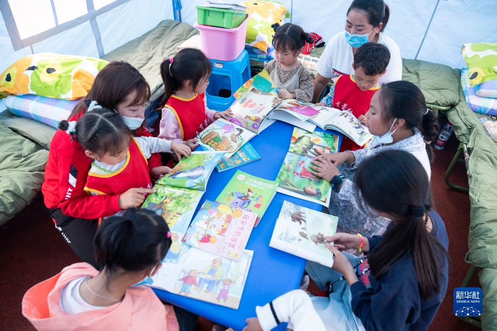 9月9日,在四川省石棉县新民乡海耳村临时安置点,老师带领孩子们看书。