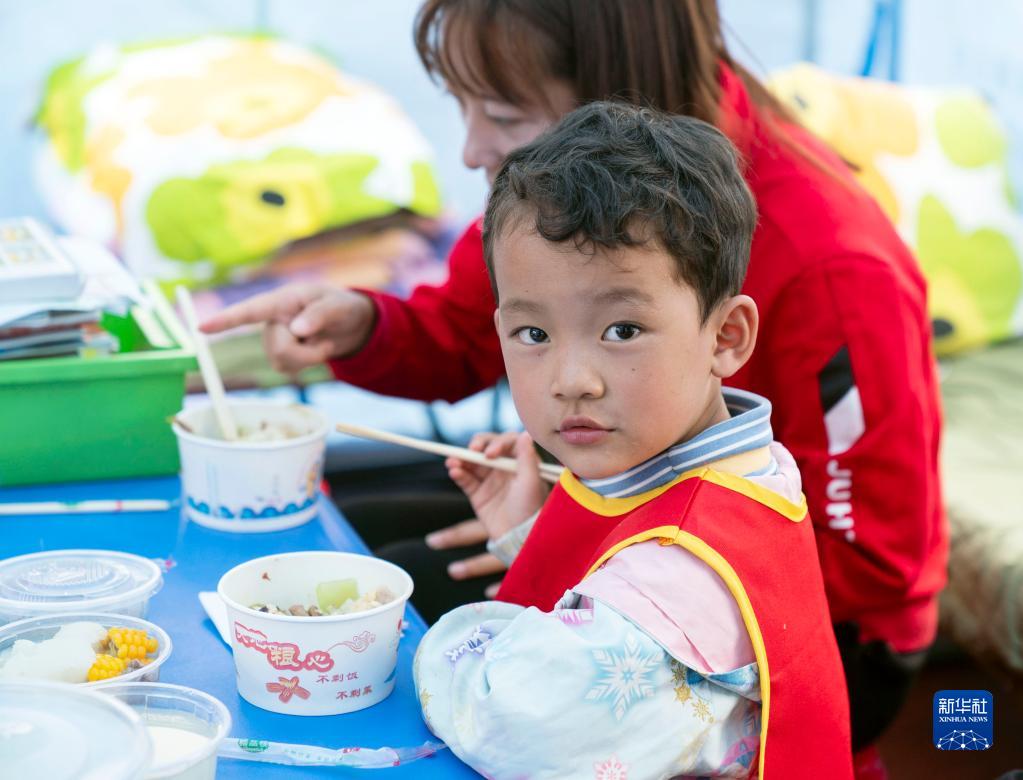 9月9日,在四川省石棉县新民乡海耳村临时安置点,小朋友在吃午饭。