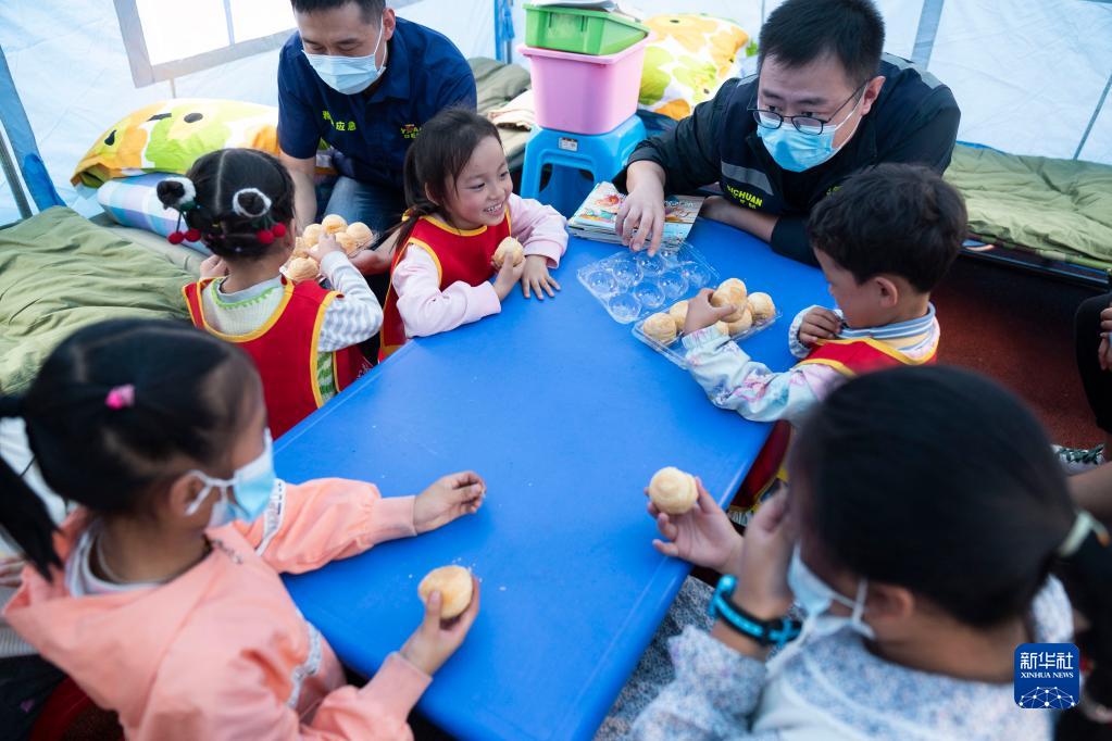 四川省甘孜州泸定县6.8级地震发生后,在雅安市石棉县的临时安置点里,老师和志愿者带领孩子们学习、画画、做游戏,在这个特殊时期安抚和陪伴他们。