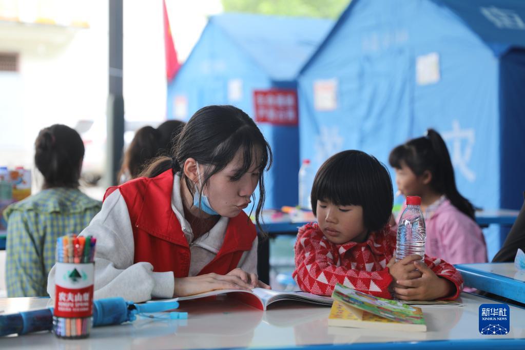 四川省甘孜州泸定县6.8级地震发生后,在雅安市石棉县的临时安置点里,老师和志愿者带领孩子们学习、画画、做游戏,在这个特殊时期安抚和陪伴他们。