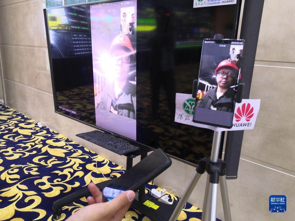 在全国首座5G煤矿潞安化工集团新元公司的调度中心,记者通过5G网络,视频采访井下矿工(2020年5月27日摄)。新华社记者 梁晓飞 摄