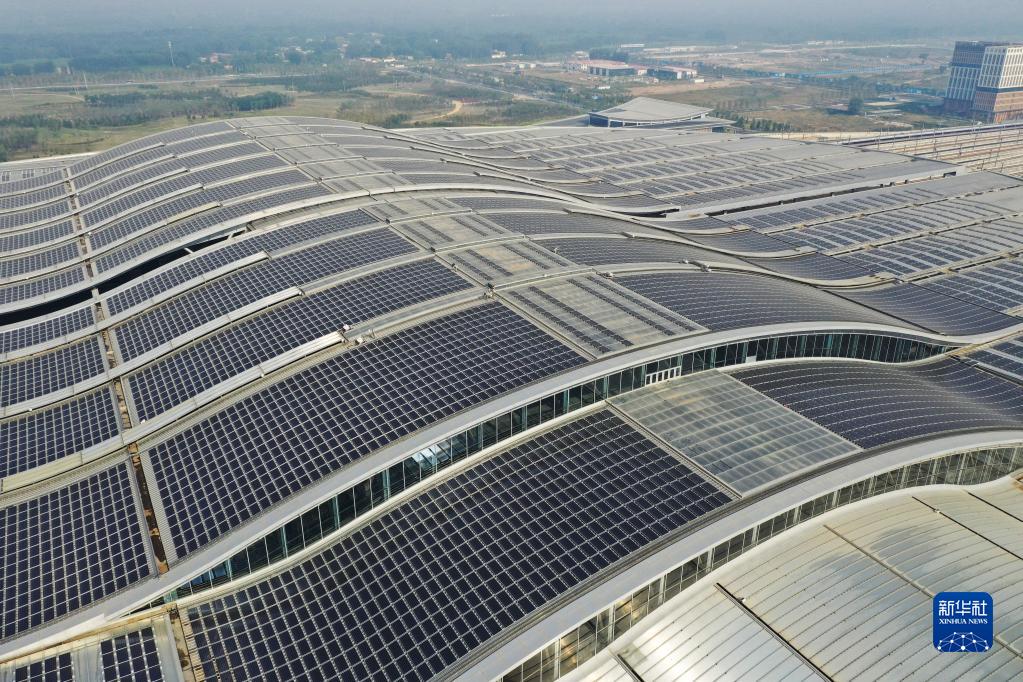 京雄城际铁路雄安站站顶分布式光伏电站(9月9日摄,无人机照片)。