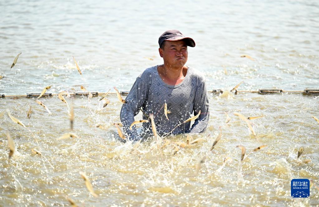 天津市滨海新区北塘街村民在虾塘拉网捕虾(9月9日摄)。