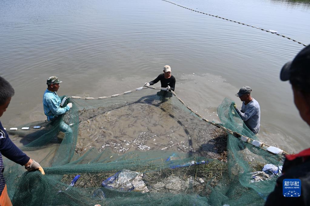 天津市滨海新区北塘街村民在虾塘拉网捕虾(9月9日摄)。