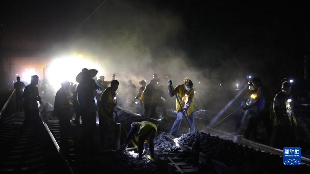 工人在柳州太阳村站进行夜间换岔施工(9月10日摄)。
