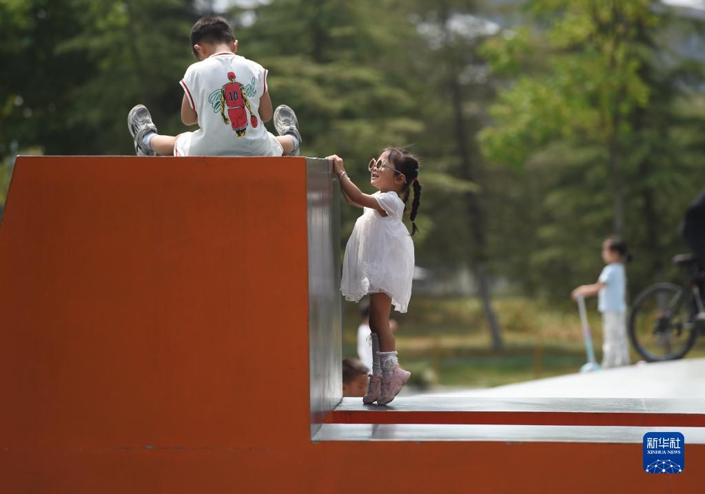9月10日,小朋友们在安徽省合肥市绿轴公园玩耍。