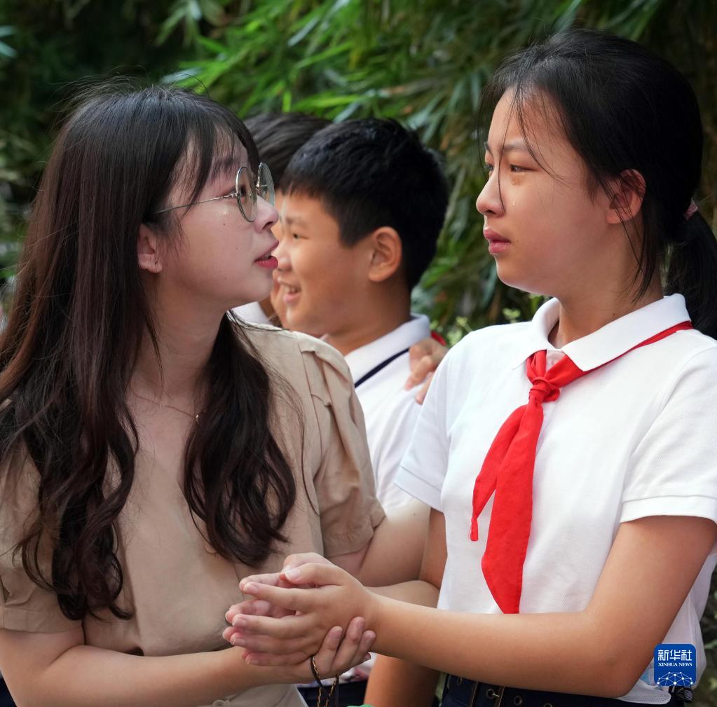 9月10日,毕业生离校时因不舍而流泪,班主任吴凝寒流着泪安慰她。