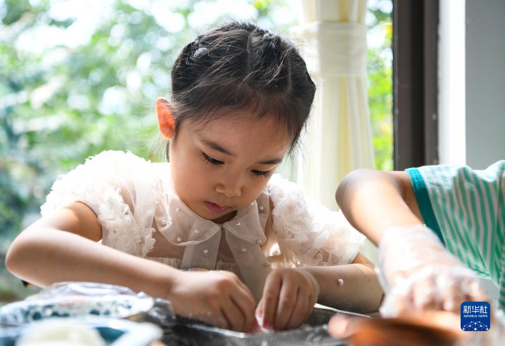9月10日,小朋友在重庆龙门浩老街学习、体验月饼制作。
