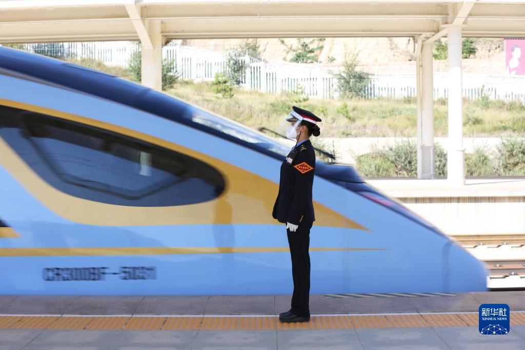 9月10日,宝兰高铁甘肃定西北站的工作人员在站台上送车。