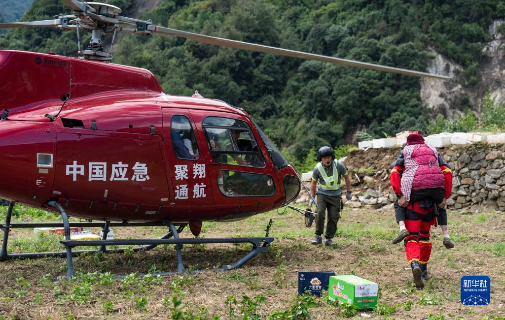 9月10日,在四川省石棉县王岗坪彝族藏族乡幸福村,救援人员在转运患病老人。