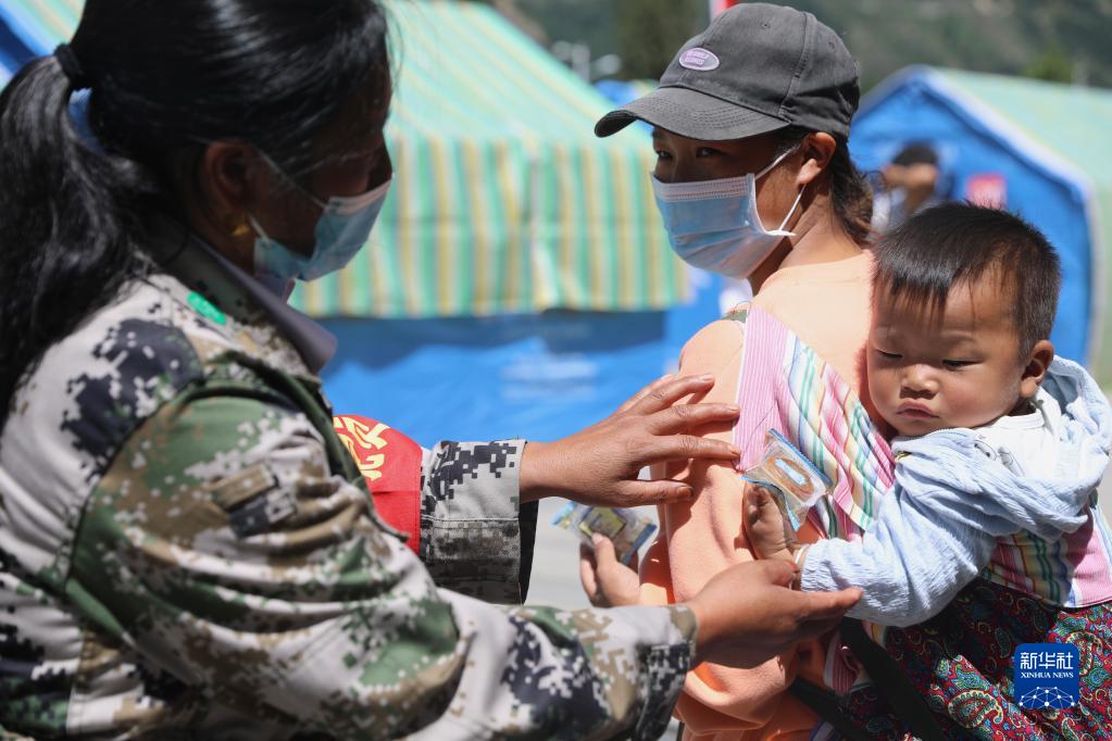 9月10日,在四川省石棉县王岗坪彝族藏族乡安置点,志愿者为受灾群众发放月饼。