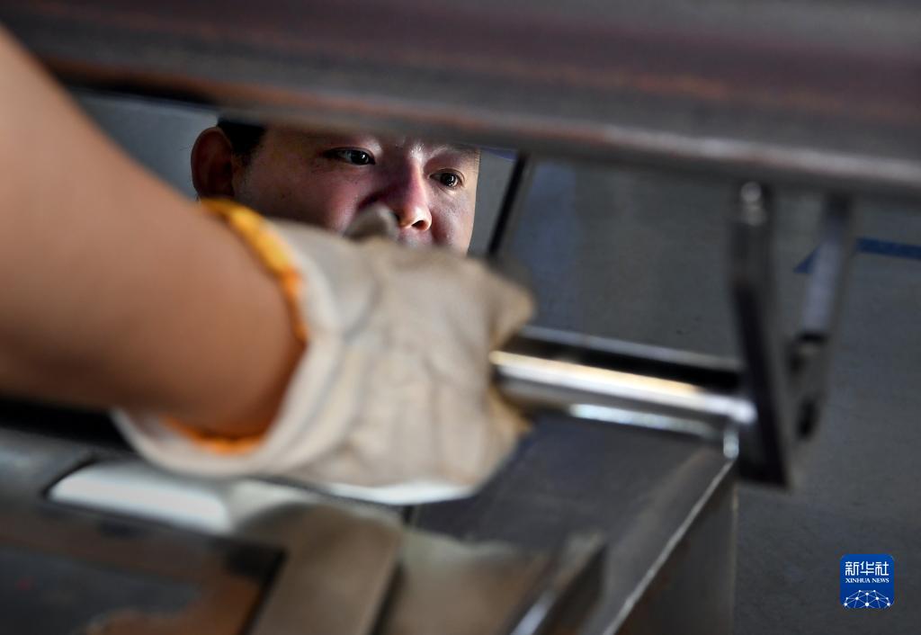 罗宇航在郑州工务机械段焊轨车间进行轨端扭曲度检查(9月9日摄)。