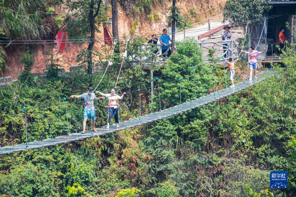 9月11日,游客在重庆市巴南区迎龙峡景区体验玻璃桥项目。新华社记者 唐奕 摄