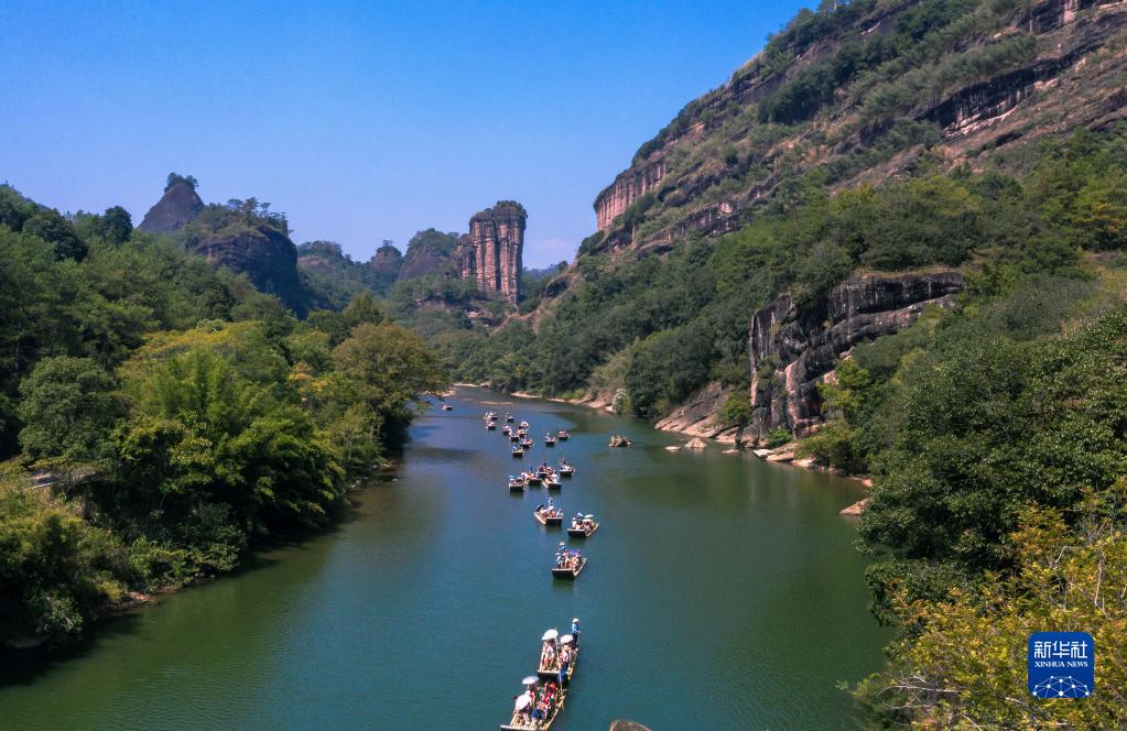 9月11日,在福建武夷山国家公园,游客乘竹筏游览九曲溪(无人机照片)。新华社发(陈颖 摄)