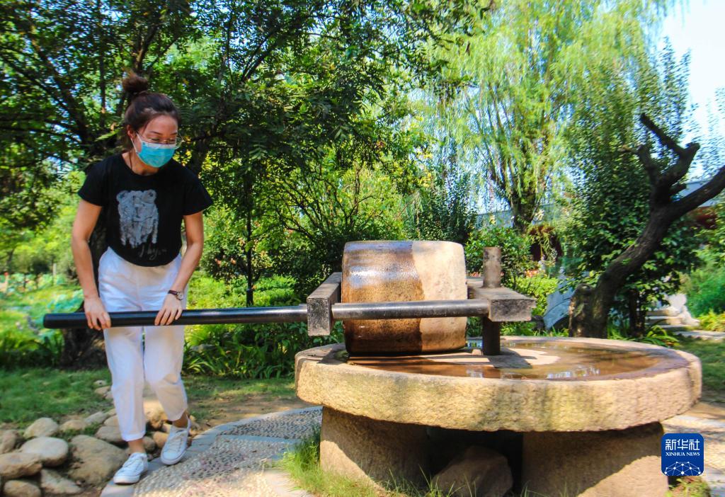 9月11日,在河南省南阳市宛城区汉冢乡万庄村卢园景区,游客体验传统农耕劳作。新华社发(高嵩 摄)