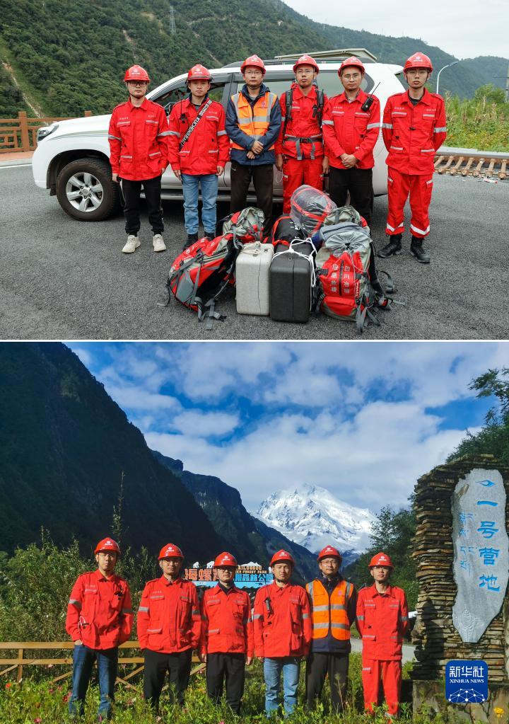 这是一张拼版照片,上图为:9月7日,四川省冶勘设计集团有限公司的6名调查队员在搭乘直升机去往海螺沟前拍摄的合影(新华社记者沈伯韩摄);下图为:9月10日,6名调查队员在海螺沟景区一号营地拍摄的合影(四川省冶勘设计集团有限公司供图)。