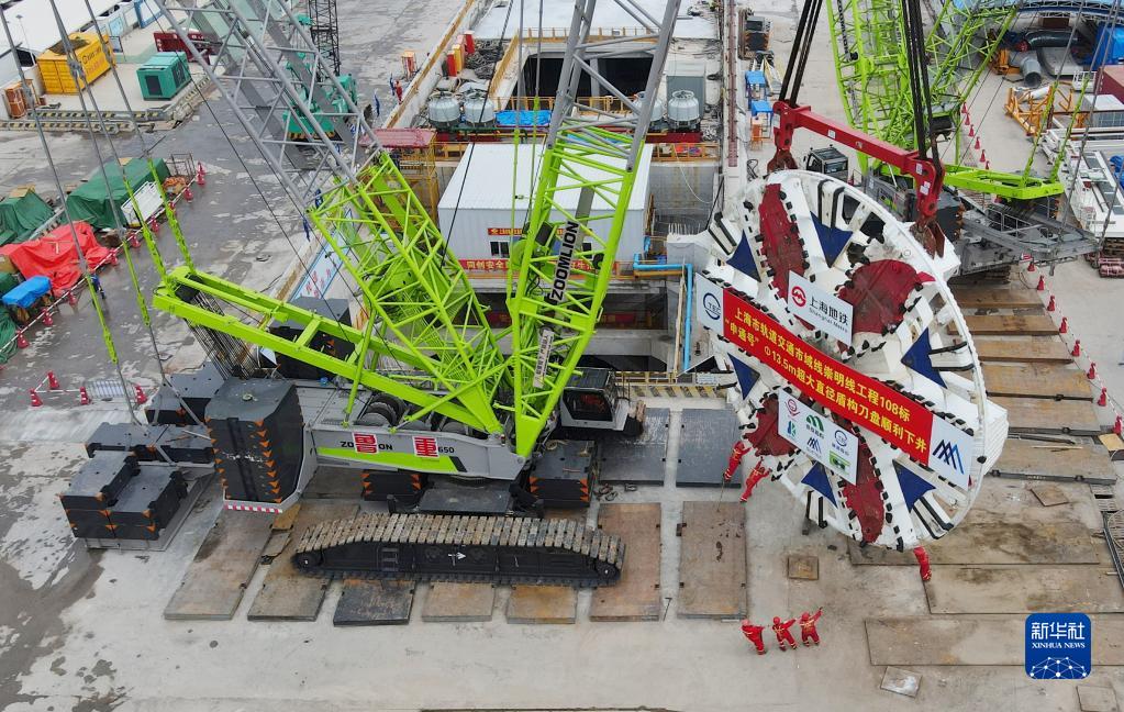 9月12日拍摄的轨道交通崇明线108标“申通号”盾构机刀盘吊装下井作业施工现场(无人机照片)。