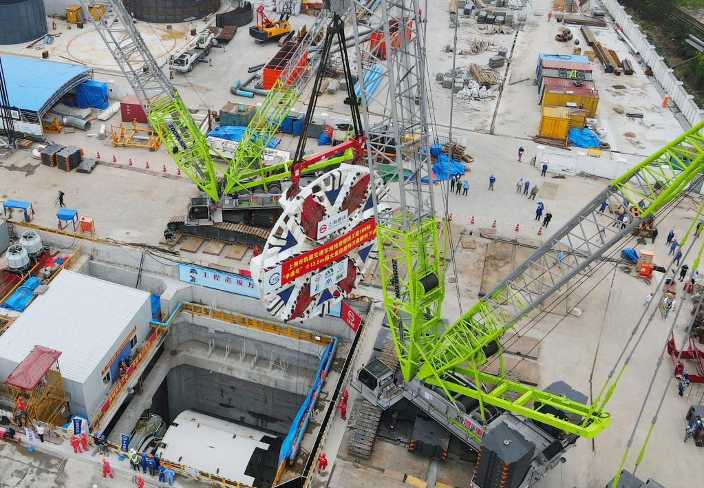 上海:轨道交通崇明线“申通号”盾构机刀盘顺利下井