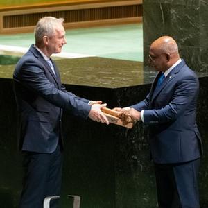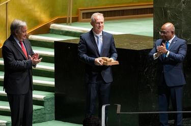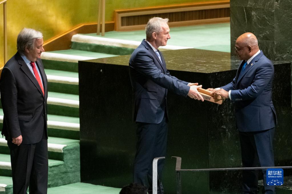 9月12日,在位于纽约的联合国总部,第77届联合国大会主席克勒希(中)从上届联大主席沙希德(右)手中接过象征联大主席权力的木槌。
