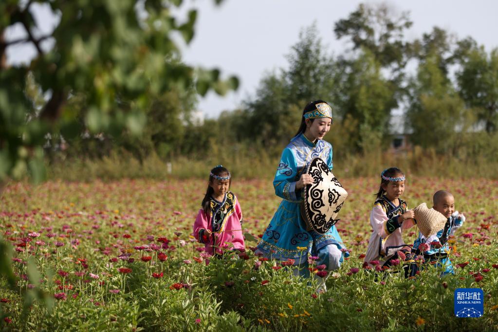 9月4日,在黑龙江抚远市乌苏镇抓吉赫哲族村,尚美含(左二)领着学生在花田里玩耍。