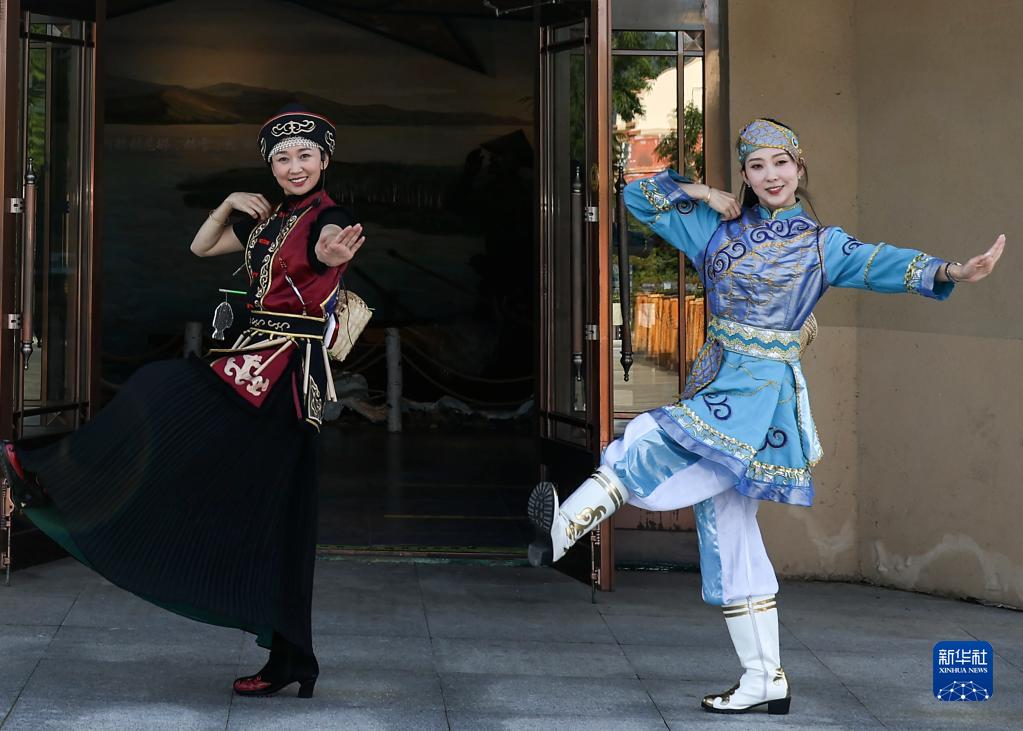 9月4日,在黑龙江抚远市乌苏镇抓吉赫哲族村赫哲民俗展示馆前,尚美含(右)表演赫哲族舞蹈。