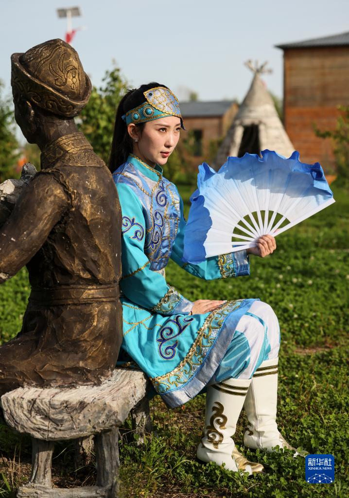 9月4日,在黑龙江抚远市乌苏镇抓吉赫哲族村,尚美含身着赫哲族服装拍摄照片。