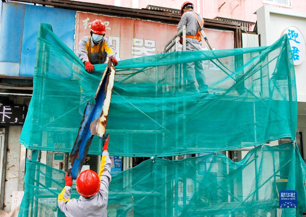 9月14日,在上海市金山区象州路,工作人员对沿街有安全隐患的店铺招牌进行拆除。