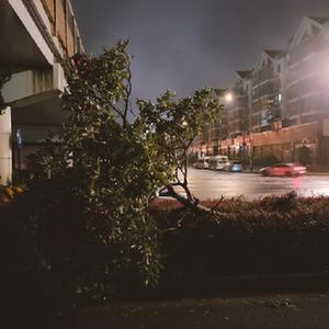 9月14日晚拍摄的浙江省舟山市普陀区东港海洲路绿化带上被风吹倒的树木(手机照片)。