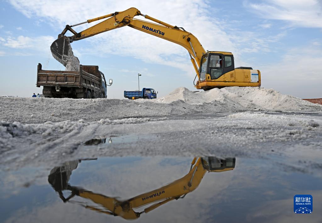 在天津长芦汉沽盐场,大型机械在盐池中进行扒盐作业(9月14日摄)。