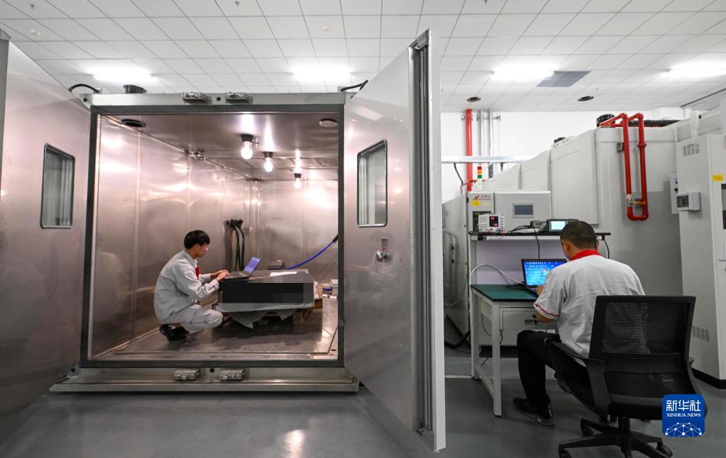 9月14日,在中汽中心新能源汽车科技创新基地能源系统部,工作人员准备某商用车动力电池组环境适应性试验。