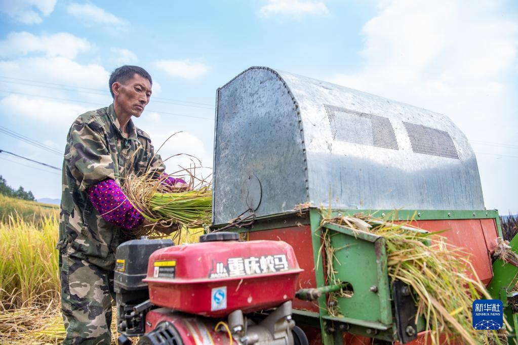 9月14日,在重庆市酉阳土家族苗族自治县花田乡,稻农在稻田里抢收稻谷。