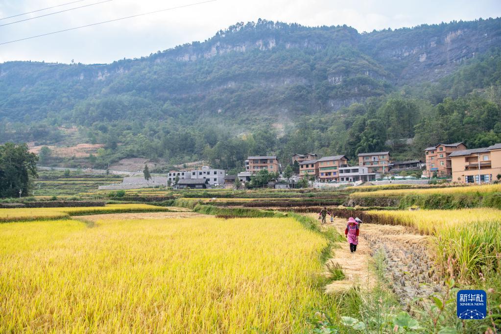 9月14日,在重庆市酉阳土家族苗族自治县花田乡,稻农在稻田里抢收稻谷。 新华社记者 唐奕 摄
