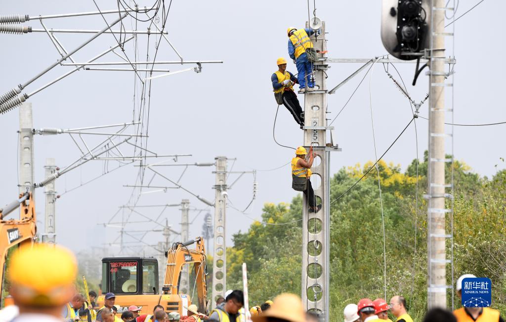 9月15日,施工人员在进行接触网施工作业。