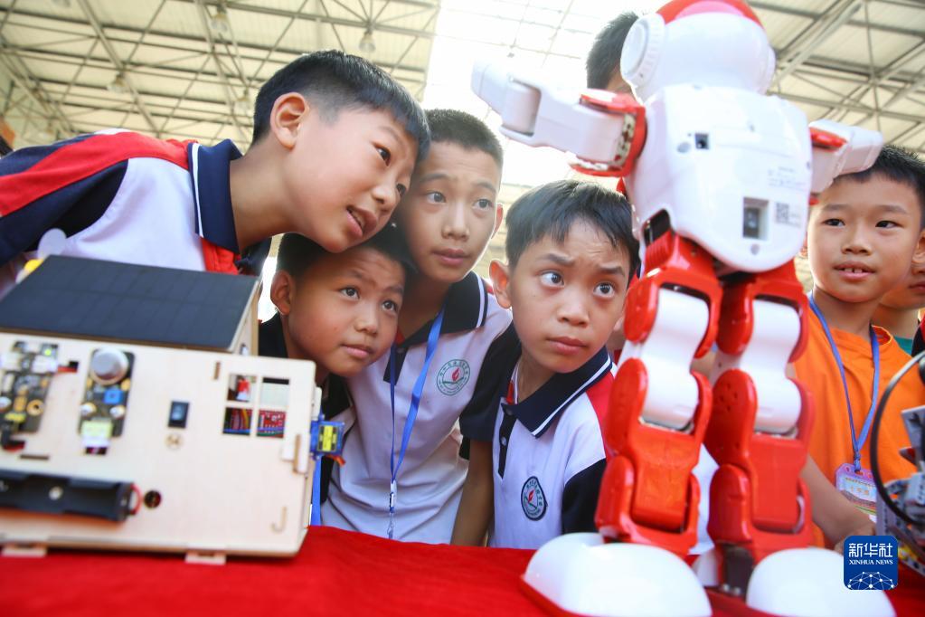 9月15日,在湖南省邵阳市隆回县思源实验学校举行的科普日宣传活动现场,学生们观看机器人表演。