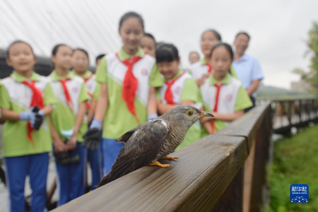 9月15日,在山东省青岛市城阳区丹山小学科普日活动上,一只放归的杜鹃准备起飞。