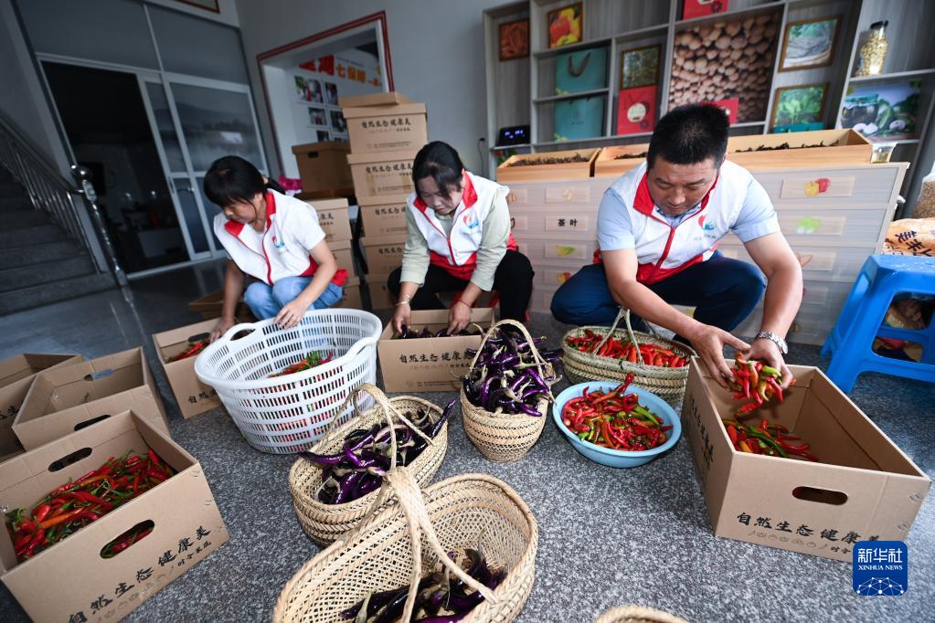 9月16日,杭州市临安区龙岗镇望湖村党员志愿者在打包从“共富菜园”采摘的蔬菜,准备销售给结对的企业。