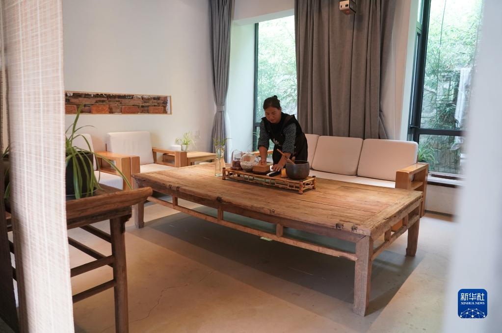 9月14日,西安市蓝田县小寨镇董岭村村民刘春玲在打扫民宿。