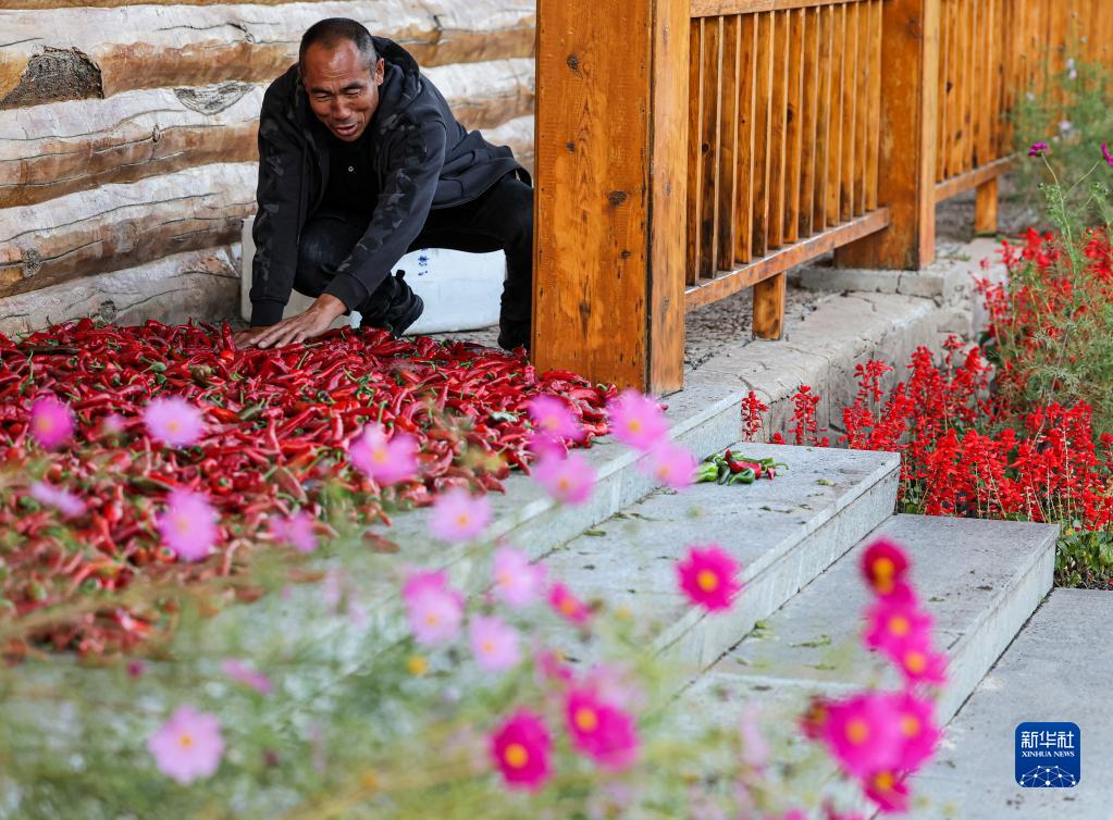 9月1日,在富锦国家湿地公园食堂前,李长吉在晾晒辣椒。