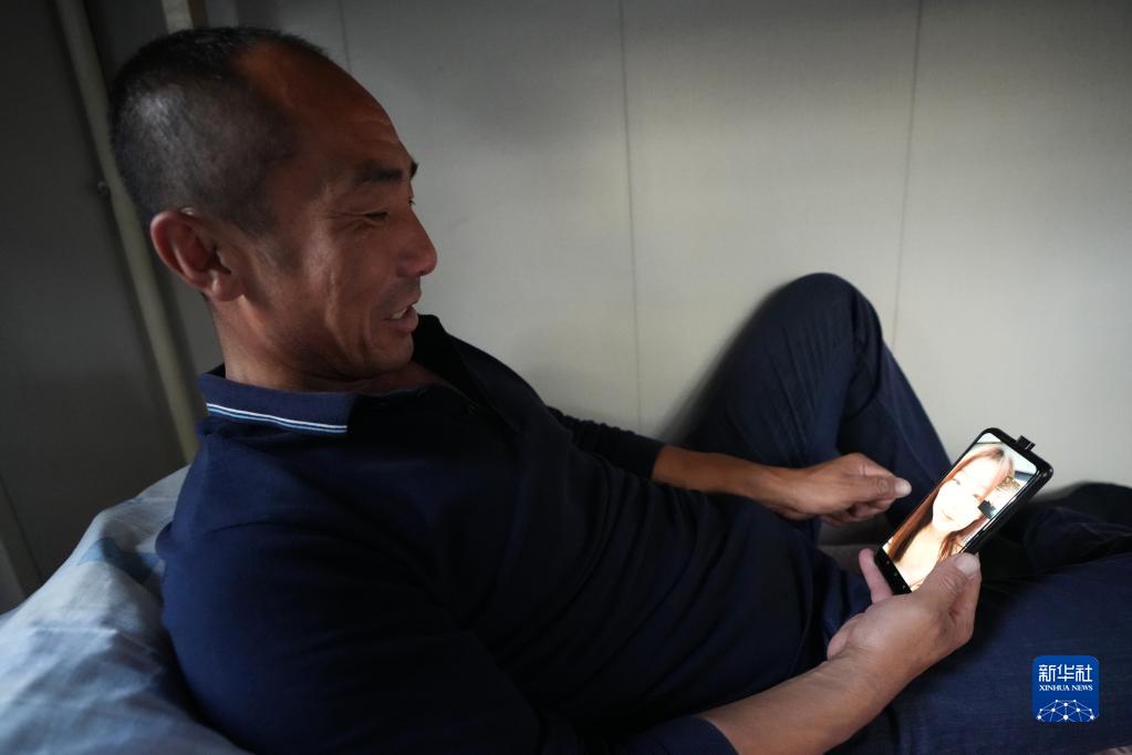 9月7日,忙碌了一天的李长吉在宿舍与女儿视频通话。