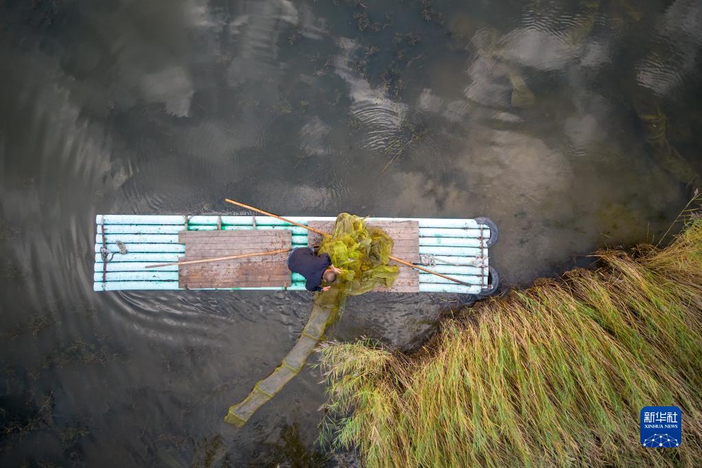 9月7日,李长吉在富锦国家湿地公园内清理水中的老旧网具(无人机照片)。