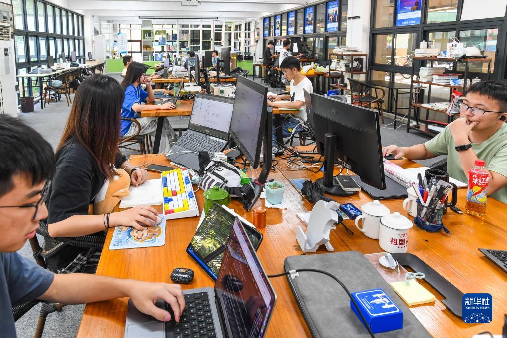 广东工业大学学生在“工大创谷”创新创业工作室编写程序(9月14日摄)。