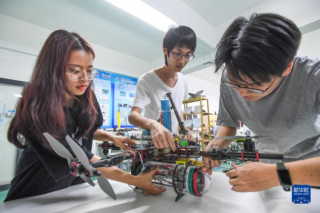 广东工业大学学生团队在“工大创谷”研发空水两栖远程巡检平台(9月14日摄)。