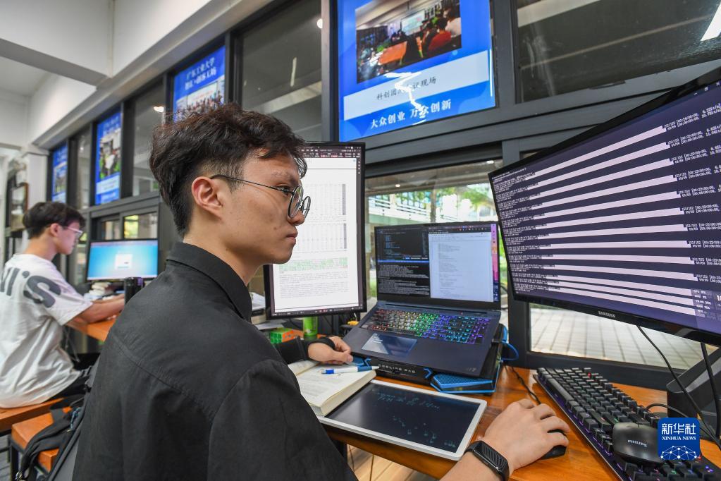 广东工业大学“工大创谷”创客工坊团队的梁梓熙(右)在编写计算机视觉深度学习程序(9月14日摄)。